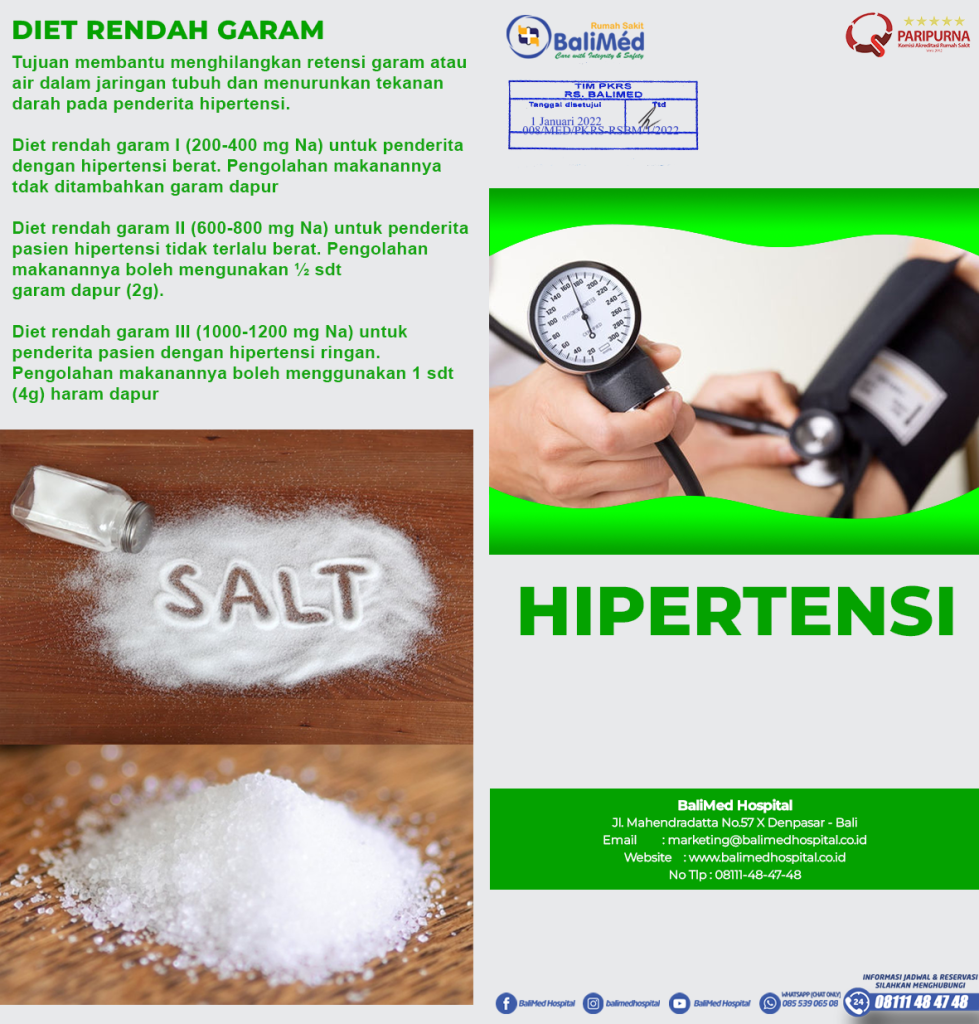 Salah satu cara paling efektif untuk menurunkan tekanan darah adalah dengan mengelola asupan garam untuk mengurangi retensi cairan di dalam tubuh. BaliMéd Hospital Denpasar merekomendasikan tiga tingkatan diet sesuai kondisi Anda: